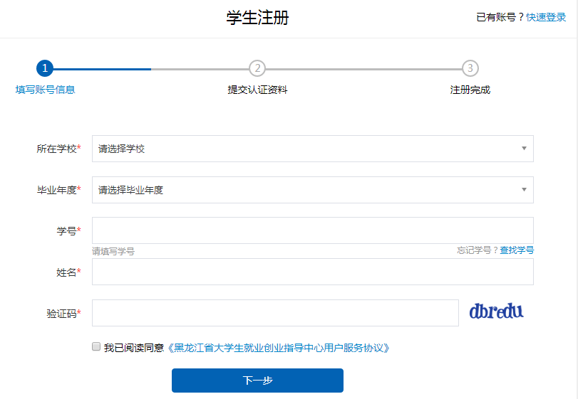 进入注册页面后,依次按要求填入信息,填入的信息要务必确保真实,提交后会自动和数据库信息进行比对,比对不通过请联系学校就业管理部门,比对通过后即注册成功。