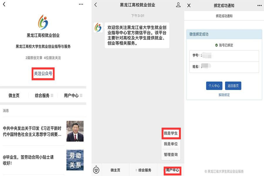 学生用个人微信扫网页上出现的二维码,关注“黑龙江高校就业创业”微信公众号,即可完成学生用户微信端绑定。点击主菜单用户中心下二级菜单【我是学生】菜单,可查看绑定状态,如未成功绑定可在此界面下进行人工绑定操作,如下图所示: