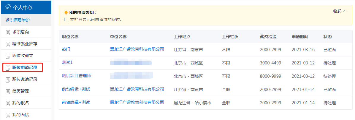 列表显示用人单位发送的全部面试邀请通知,如下图所示: