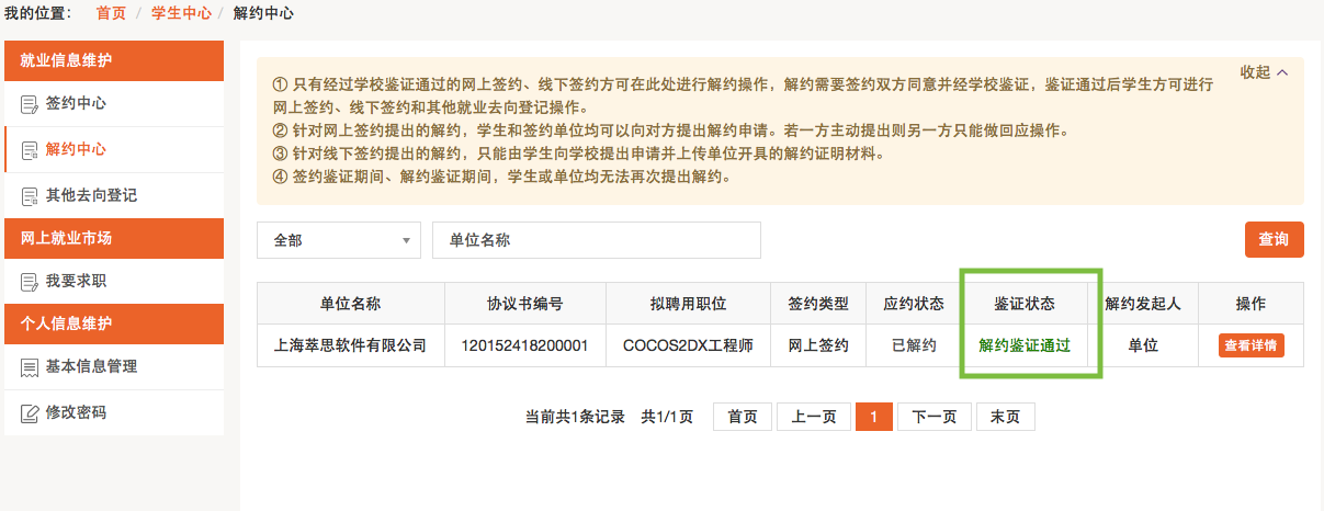 操作后,学生回到解约中心,可持续关注学校审核的结果,如下图所示: