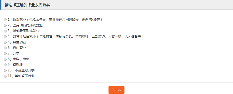 点击【编辑】打开学生的就业情况详细界面,通过向导选择毕业去向分支和报到证签发类别(使用网签系统的学生不需要选择就业去向和报到证签发类别),如下图所示: