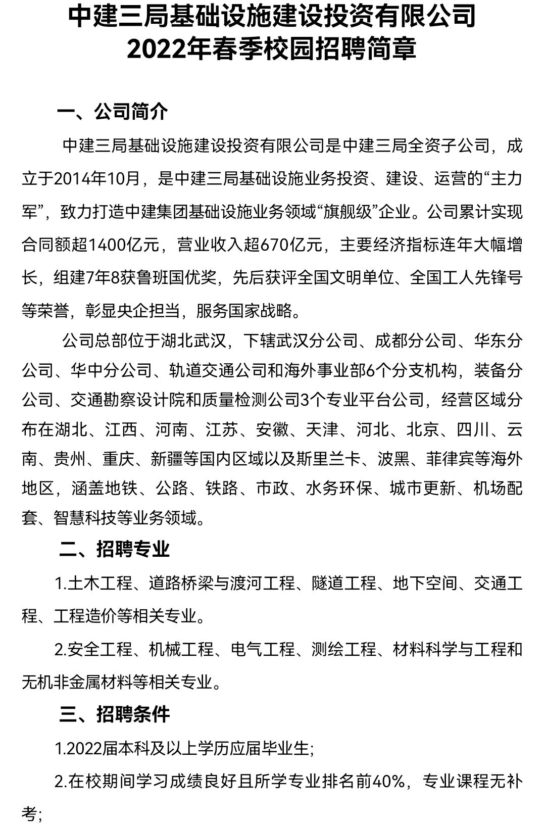 中建三局基础设施建设投资有限公司2022年春季校园招聘简章