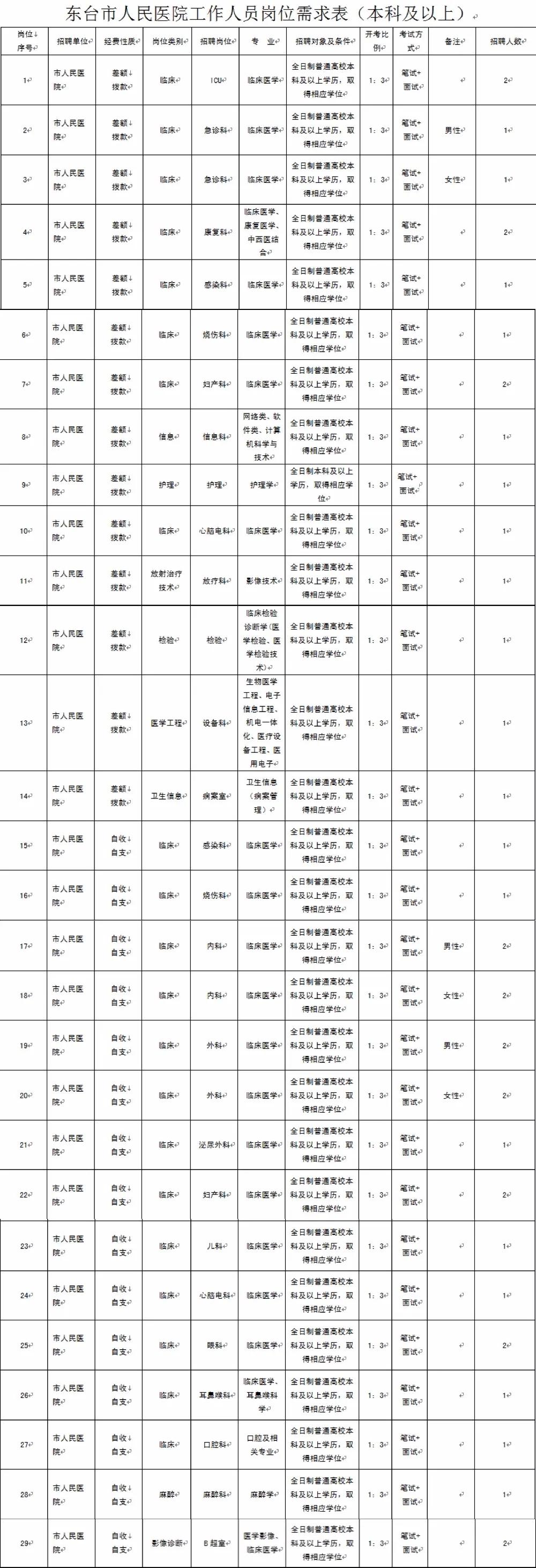 东台市人民医院始建于1950年,是一所集医疗、教学、科研、预防保健及康复为一体的综合性医疗服务中心。现为南通大学、江苏医药职业学院附属医院,南京医科大学、江苏大学教学医院,上海交通大学附属第一人民医院、上海同济大学附属第十人民医院协作医院,南通大学附属医院战略联盟医院,国家级住院医师规培基地协同基地,江苏省示范基层卫生人员实训基地。 医院核定床位800张,开放床位1150张。全院计有61个临床医技科室,现有在职职工1423人,卫技人员为1278名,其中高级职称288人,博士3人、博士在读2人,硕士74人、硕士在读56人。 全院共有盐城市医学重点学科2个、建设单位1个,盐城市临床重点专科8个、建设单位1个;建有1个名医分中心、18个名医工作室;建成东台市互联网医院(东台市人民医院互联网医院);五大信息中心(远程会诊、影像诊断、心电诊断、临床检验病理、消毒供应)。 一、优惠政策: 东台市人民医院热诚欢迎各类医学人才加盟,医院聘用后可享受如下优惠政策: (一)临床医学类博士医院提供购房补贴80万元,连续5年给予人才补助20万元/年/人。 (二)临床医学类专业型硕士,医院连续3年给予人才补助10万元/年/人;学术型硕士,连续3年给予8万元/年/人的人才补助。 (三)临床医学类本科毕业生医院连续5年给予2-5万元/年/人的人才补助。 引进的硕士、成熟人才及全日制高校本科毕业生,聘用时如已取得规培证书和执业医师证书,医院再一次性给予补助20万元/人。 (四)成熟型卫技人员,在二级综合及以上医院工作满3年以上,正高、副高及中级职称分别给予30万元、25万元、20万元的一次性补助。 (五)提供一年过渡性住宿。 (六)所在岗位通过公开考录后办理事业编制入编手续。 二、预约报名方式: 全日制普通高校毕业的临床医学类本科及以上学历人员,并取得相应学位人员(35周岁以下),应往届毕业生均可将个人信息发送至jsdtryb@163.com邮箱。 三、联系人: 张美和 联系电话:18905111108 杨 宇 联系电话:13851036222 院办室 联系电话:0515-85253636 传 真 联系电话:0515-85253636 四、东台市人民医院人才需求表: