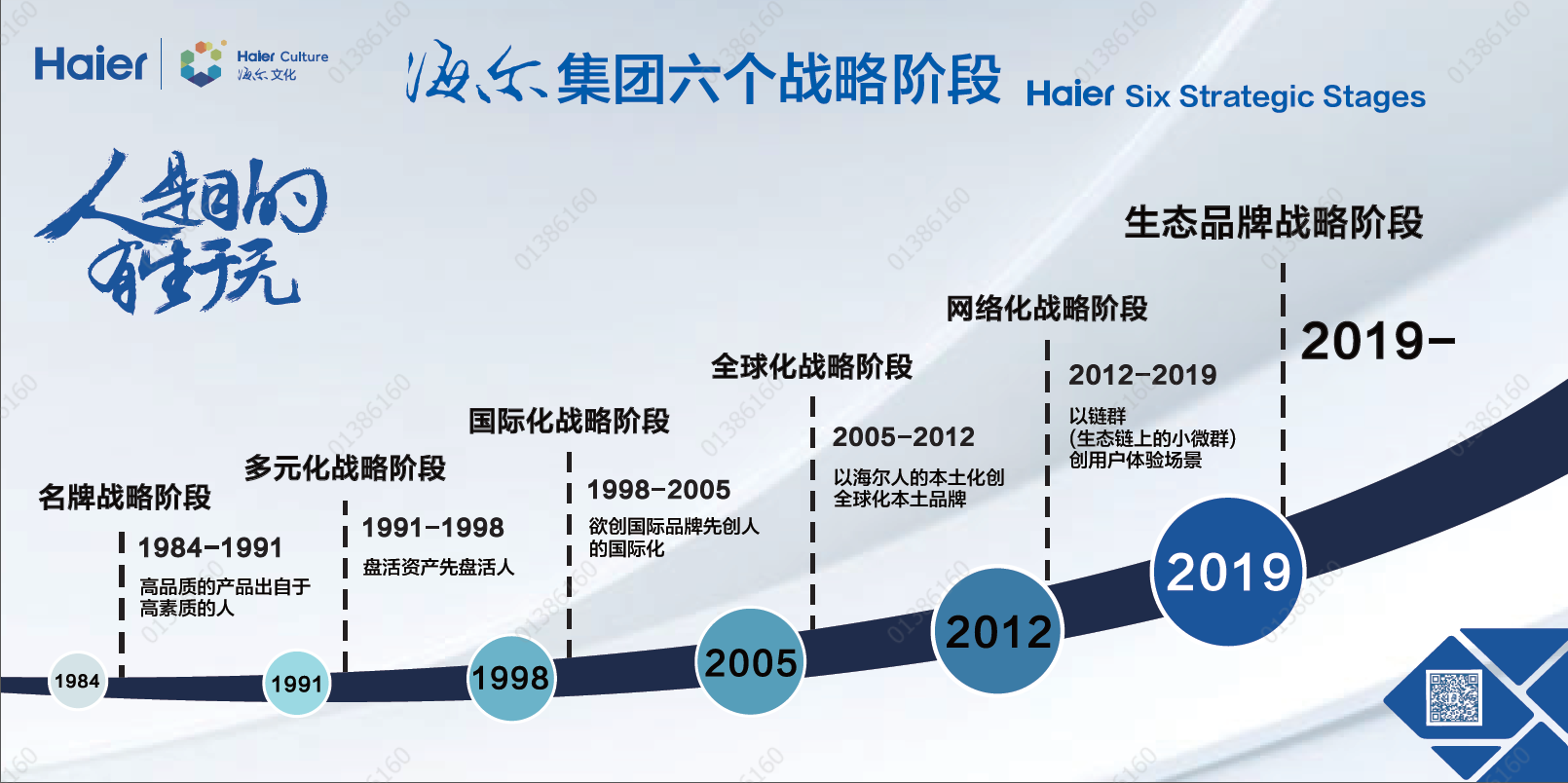 1984年创业至今,海尔集团经历了名牌战略发展阶段、多元化战略发展阶段、国际化战略发展阶段、全球化品牌战略发展阶段、网络化战略发展阶段五个阶段,201912月,进入第六个战略发展阶段,目标是创引领的物联网生态品牌。创业以来,海尔致力于成为“时代的企业”,每个阶段的战略主题都是随着时代变化而不断变化的,重点关注的就是人的价值实现,使员工在为用户创造价值的同时实现自身的价值。