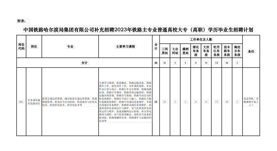 附表:中国铁路哈尔滨局集团有限公司补充招聘2023年普通高校大专(高职)学历毕业生计划表