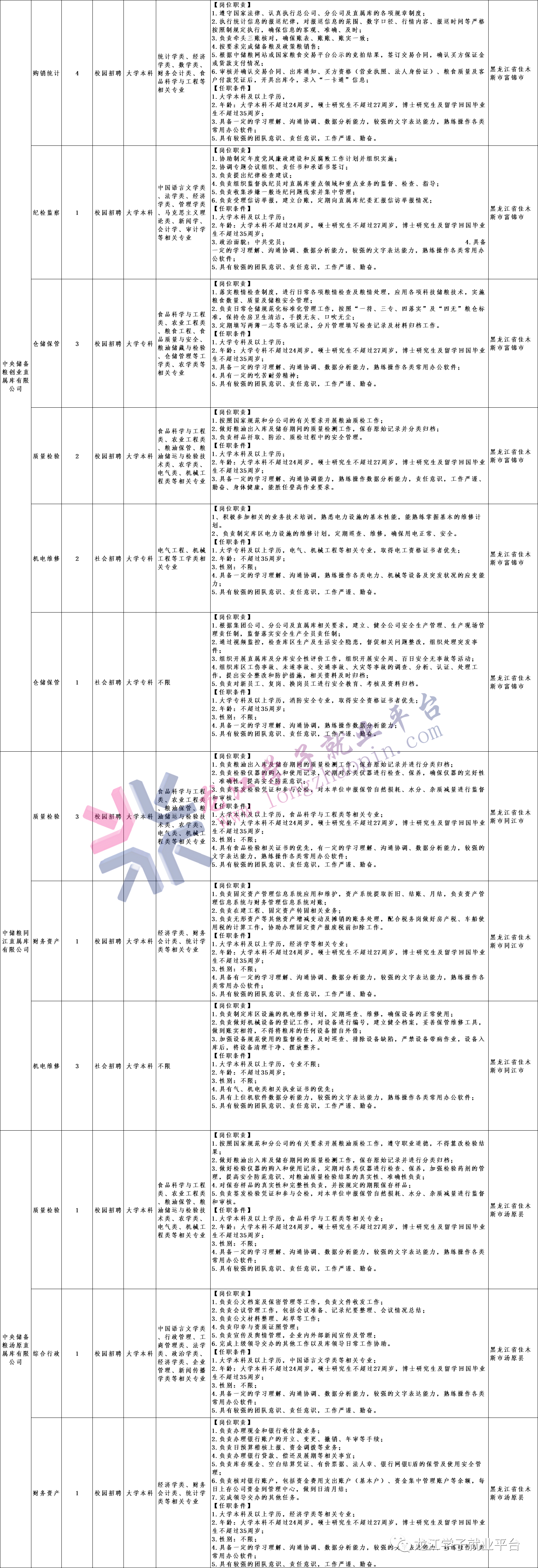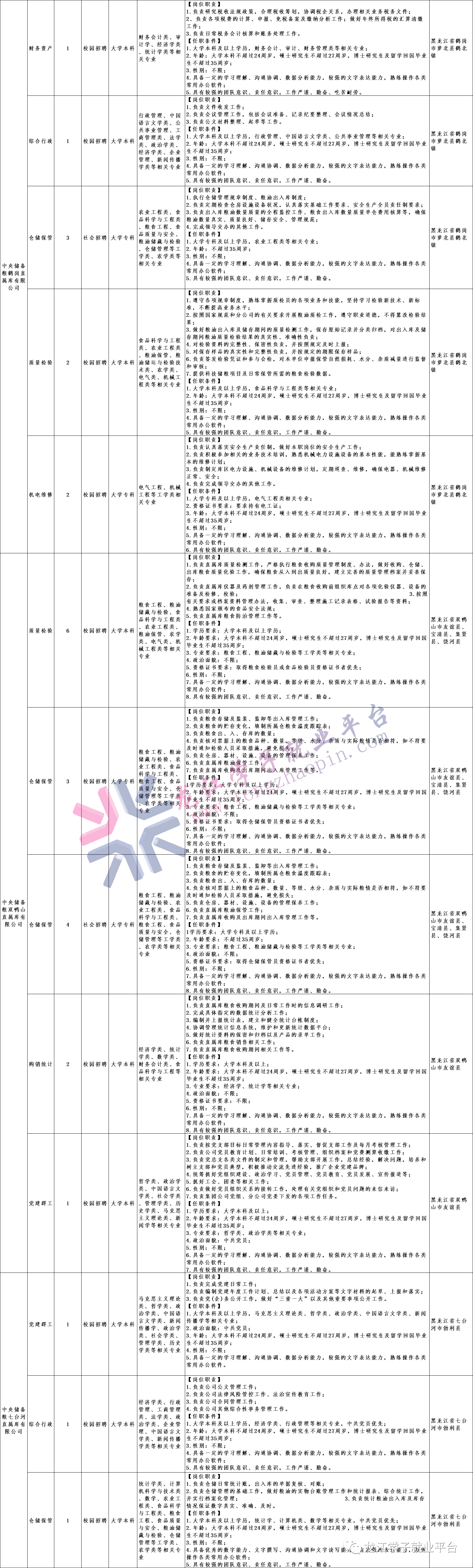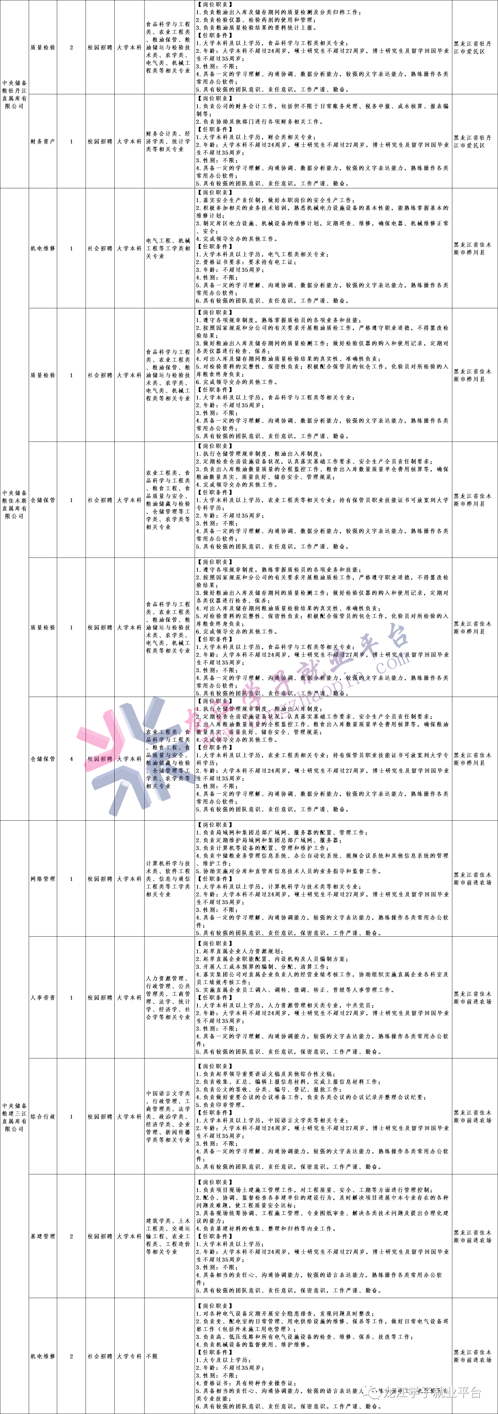 本次招聘为中储粮集团黑龙江分公司辖区直属企业岗位,包括仓储保管、质量检验、购销统计、综合行政、财务资产、党建群工、人事劳资、纪检监察、机电维修、网络管理、法务合规、基建管理等岗位。