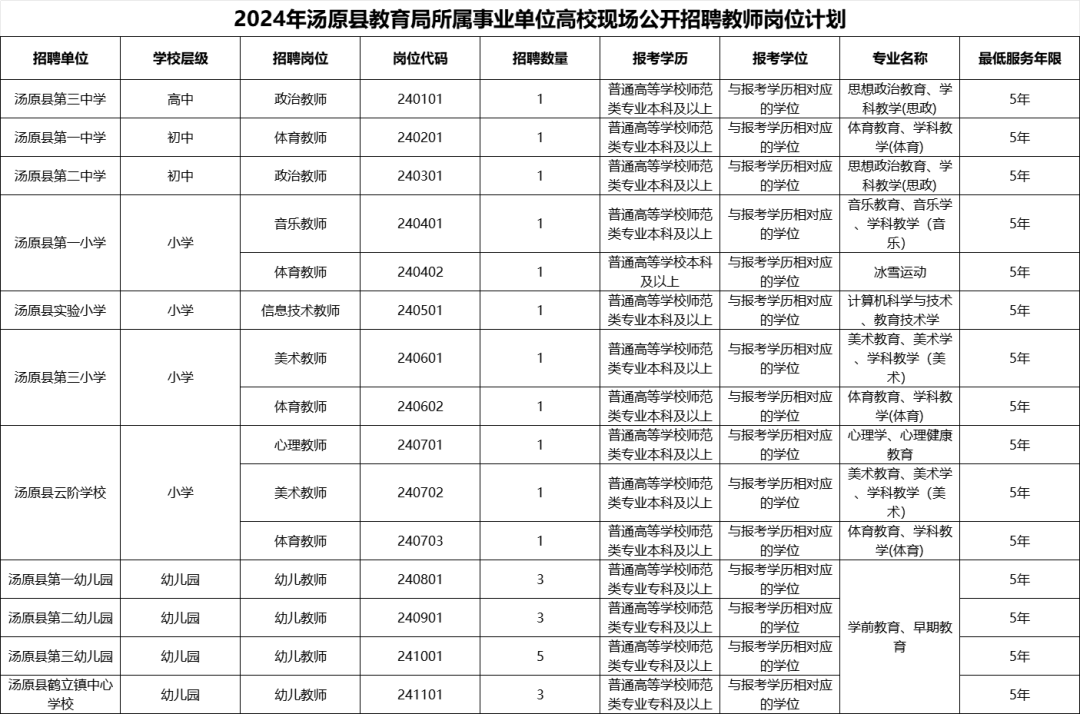 本次计划招聘教育局所属事业单位教师25名,具体招聘单位、岗位、人数、条件等情况详见《2024年汤原县教育局所属事业单位高校现场公开招聘教师岗位计划》(附件1)。符合招聘岗位要求条件的2024年普通高等院校专科及以上毕业生。4.一般为18周岁以上、30周岁及以下,即1993年3月15日(含)至2006年3月14日(含)期间出生,硕士研究生35周岁及以下(1988年3月15日(含)后出生)。7.具有与报考岗位相应的教师资格证书(教师资格国考合格证明或师范生教师职业能力证书)。教师资格证书应于2024年7月31日前取得,否则将取消聘用资格。8.毕业证、学位证应于2024年7月31日前取得,否则将取消聘用资格。学历(学位)须为国家教育行政主管部门承认,专业以国家教育行政主管部门公布的研究生、本科、职业教育专业目录和人社部公布的技工院校专业目录为准。3.曾因犯罪受过刑事处罚的人员和曾被开除公职的人员。5.报考岗位聘用后构成《事业单位人事管理回避规定》(人社部规〔2019〕1号)第六条所列情形的岗位。6.按相关规定不得参加报考或聘用为事业单位工作人员的其他情形人员。招聘采用发布公告、现场报名及资格审查、考试、签订协议、考核、体检、公示、聘用的方式进行。招聘公告在黑龙江省事业单位公开招聘服务平台(网址:http://gkzp.renshenet.org.cn/)、汤原县人民政府网(网址:https://www.tangyuan.gov.cn/)、汤原县人力资源和社会保障局公众号上发布。公告时间为2024年3月15日至2024年3月25日。本次招聘采取现场报名的方式,由本人现场报名并填报相关表格。汤原县教育局立足于哈尔滨师范大学、牡丹江师范学院、齐齐哈尔大学、佳木斯大学、黑河学院、绥化学院、哈尔滨幼儿师范高等专科学校、黑龙江幼儿师范高等专科学校等院校,报名时间及地点见各高校招生就业处通知。应聘者需携带相关材料由招聘单位进行现场资格审查。应聘考生只能选择一个岗位报名。通过资格审查的报名人数与岗位招聘人数之比原则上不得低于3:1,达不到这一比例的,按规定可减少该岗位的招聘人数或者取消该岗位的招聘或适当降低开考比例。2.预毕业证明、学生证、院系推荐表、教育部学籍在线验证报告(学信网打印)。3.教师资格证书(教师资格国考合格证明或师范生教师职业能力证书)。7.2寸同底近期免冠照片2张及《汤原县教育局所属事业单位赴高校现场公开招聘教师报名表》(附件2)。考试采取面试的方式,主要测试岗位专业知识、业务素质及潜在能力等。面试项目为教学能力测试和专业素质测试,面试成绩=教学能力测试成绩(满分70分)+专业素质测试成绩(满分30分),面试成绩满分为100分。①确定应聘者考试顺序。应聘者现场抽取考试顺序,未按规定的考试时间到场者,按自动弃权处理。②教学能力测试。主要考查应聘人员的学科知识体系、课程意识和能力、教学设计、教学实施、教学评价、运用教学资源等能力,以及教学语言和提问、板书、讲解等基本技能。每位应聘人员备课30分钟,教学能力测试(试讲)时间10分钟。各专家考核组评委严格按照教学能力测试考核项目、权重进行量化打分。考核结束后,取有效分的平均值,即得出该考生的该项成绩,成绩保留两位小数,尾数“四舍五入”。教学能力测试后直接进行专业素质测试(答辩)时间5分钟。主要考查应聘人员的教育理念、师德修养、仪表仪态、行为举止、思维能力和语言表达能力,以及培养学生、管理学生等素质和能力。内容:①教育理论知识或案例分析;②专业理论知识。各专家评委严格按照专业素质测试的考核权重进行量化打分,取有效分的平均值,即得出该考生的该项成绩,成绩保留两位小数,尾数“四舍五入”。面试成绩保留小数点后两位(四舍五入),低于70分者不予聘用。考官由不少于7人(单数)专家组成,现场打分,现场公布成绩。面试时间、地点另行通知。当末位面试成绩出现并列时以教学能力测试成绩优先,如依然并列,则进行加试,加试方案另行公布。面试后根据招聘计划人数和应聘人员面试成绩从高分到低分1:1比例等额确定签订协议、考核与体检对象。由招聘单位与进入考核人选现场签订《全国普通高等学校毕业生就业协议书》,如在现场签订时,不同意签订《全国普通高等学校毕业生就业协议书》者视为自动放弃聘用。可根据面试成绩由高分到低分依次等额递补,如遇有特殊情况,须按规定报备。签订协议后7个工作日内在汤原县人民政府网公布拟进入考核与体检人员名单(含相关人员考试总成绩)。1.考核。主要是对应聘人员的思想政治表现、道德品质、业务能力、工作实绩等情况采取多种方式进行考核,并对应聘人员资格条件,是否具有报考回避情形等方面情况进行复查。凡发现档案材料和信息涉嫌造假的,未查实前暂缓聘用程序;对考核不合格人员,不作为拟聘用人选,并书面通知本人。2.体检。考核合格者方可参加体检。体检工作按照人力资源和社会保障部、国家卫生计生委、国家公务员局《关于修订〈公务员录用体检通用标准(试行)〉及〈公务员录用体检操作手册(试行)〉有关内容的通知》(人社部发〔2016〕140号)等规定执行。体检在二级甲等以上综合性医院进行,体检费用由考生自行承担。体检不合格人员,招聘组织实施单位提供一次复检机会。复检项目由招聘组织实施单位会同复检医疗机构