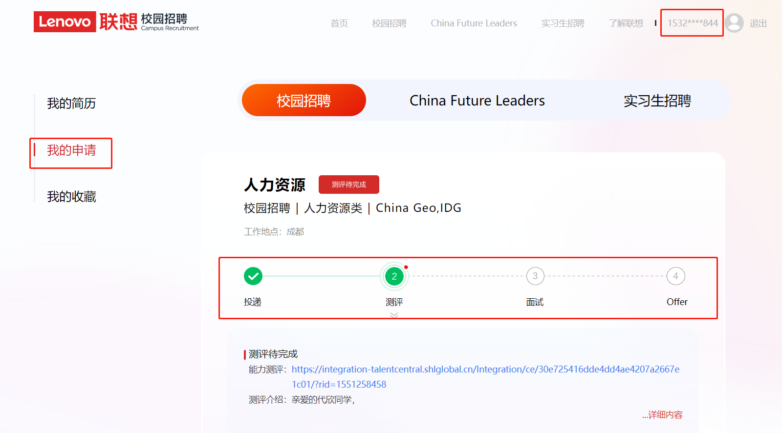 查询路径:联想校招官网-个人中心-我的申请,可以查看自己所处阶段及当前的状态