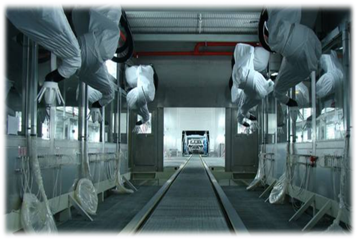 生产车间主要设备:瑞士苏泰克激光拼焊生产线、德国KUKA自动化生产线、瑞士?ABB全自动机器人柔性生产线、法国SAMES静电悬杯、日本YASKAWA壁挂机器人、AGV举升系统。