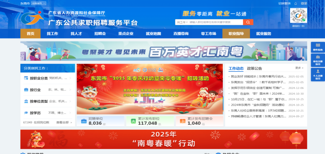 3月16日,2025年全国城市联合招聘高校毕业生春季专场活动启动仪式暨“百万英才汇南粤”春季大型综合招聘会在广州琶洲国际会展中心启幕。活动整合粤港澳及16个兄弟省市人才服务资源,集结上千家单位超5万个岗位现场引才,超万家单位在线招聘,发动全国超1000所高校毕业生线上线下参加。 目前,线上招聘还在火热持续推进中。东莞现已组织1300多家用人单位线上报名参会,提供优质岗位2.4万个。欢迎广大企业和求职者报名参与活动!
