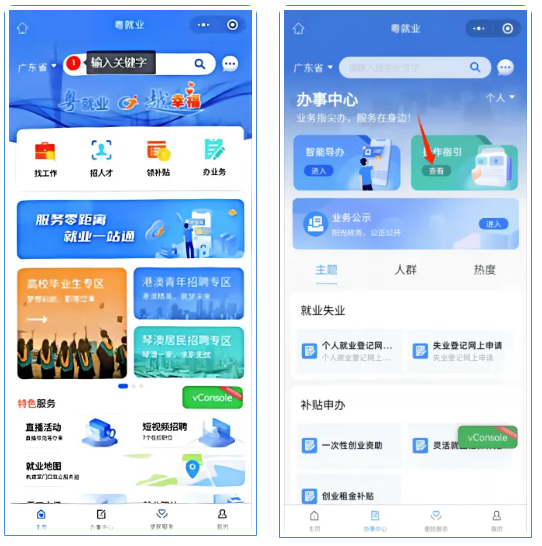保姆级求职攻略! 省平台+"粤就业"小程序全流程指南 助你轻松应聘! 省平台+"粤就业"入口: 网页端: 广东人社公共招聘服务平台 https://ggfw.hrss.gd.gov.cn/recruitment/internet/main/#/home 移动端: 微信搜索“粤就业”小程序或通过“粤省事”→“就业”板块进入 “粤就业”小程序二维码