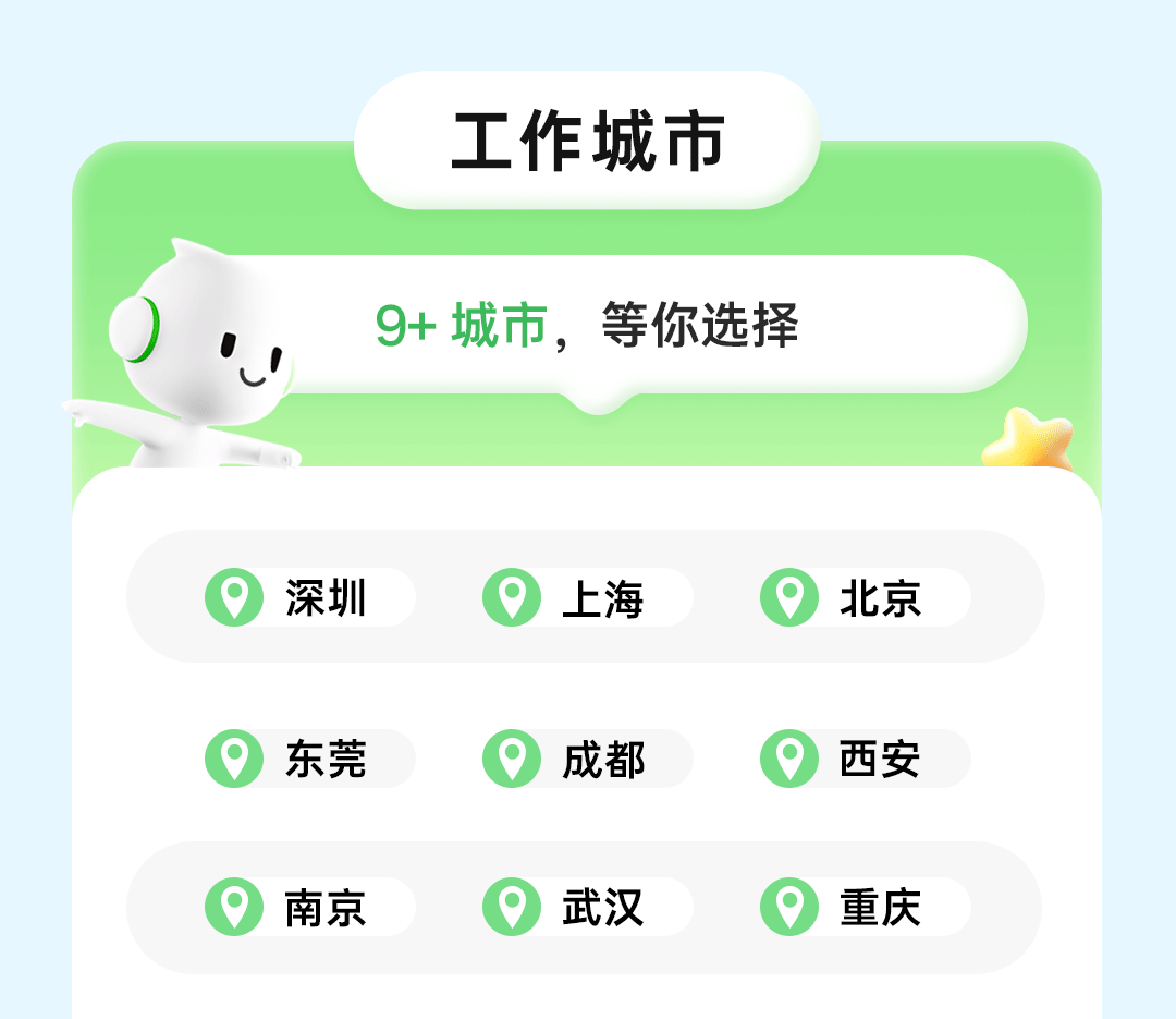 工作城市:广东省深圳市,上海市,北京市,陕西省西安市,湖北省武汉市
