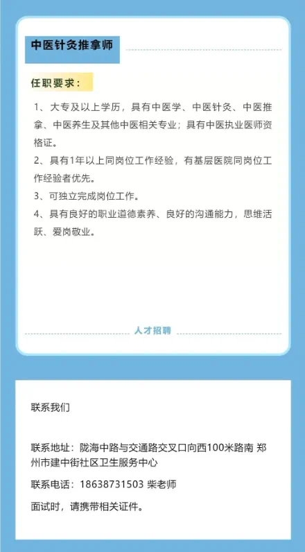 郑州市建中街社区卫生服务中心招聘针灸推拿师