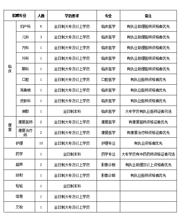 5、年龄要求:护理、文秘、信息专业30岁以下,医疗及其他专业40岁以下。