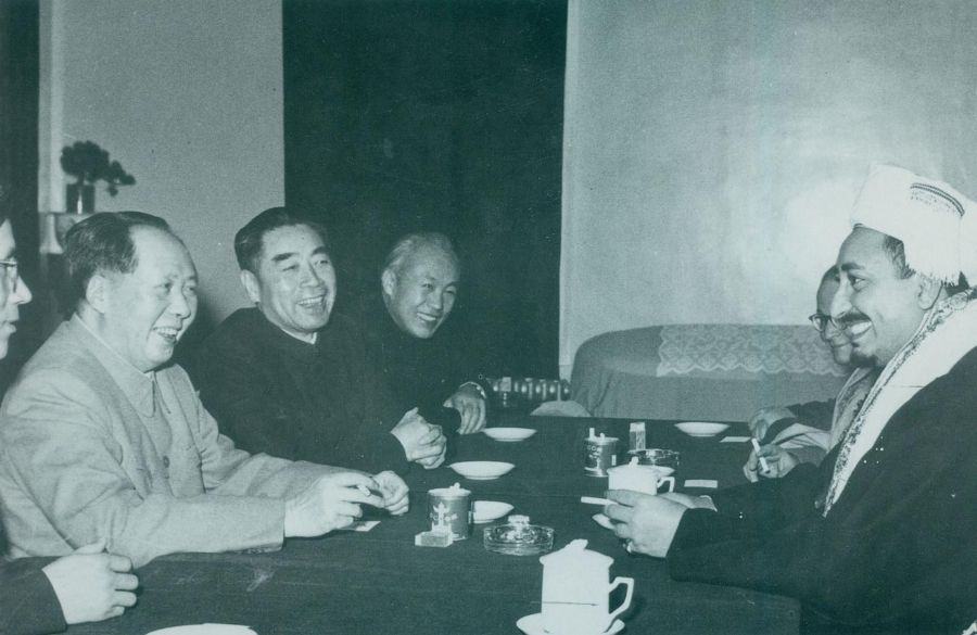 1958年1月3日,周恩来陪同毛泽东在杭州会见也门王国副首相兼外交大臣和国防大臣巴德尔王太子(右一)及其随行人员。
