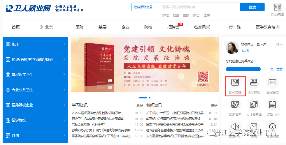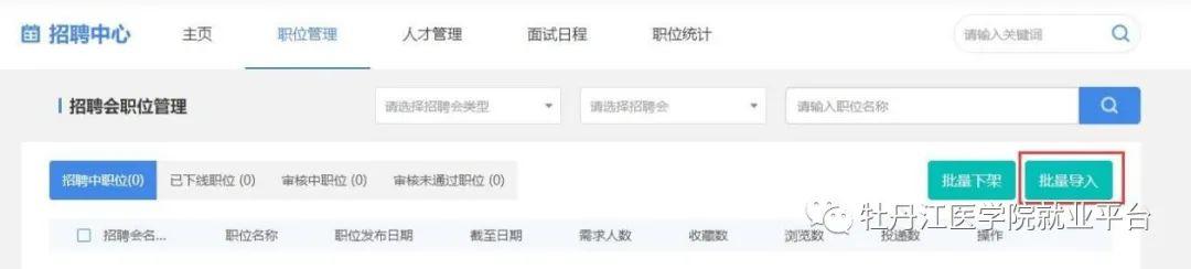 1.点击网站首页右侧单位工作台【职位管理】发布职位,职位类别请选择【招聘会职位】,并选择【2022年全国医药卫生行业春季校园网络招聘会牡丹江医学院】场次,准确填写职位信息后点击【发布】提交后台审核。职位信息审核通过后将于招聘会开始日(4月8日)统一在招聘会界面展示。