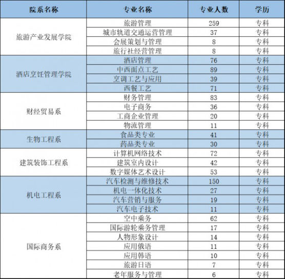 ◆学院专业设置及毕业生情况:学院现有旅游产业发展学院、酒店烹饪管理学院、财经贸易系、生物工程系、国际商务系、建筑装饰工程系、机电工程7个院系,共计开设40个专业,2020届毕业生共计1309人。