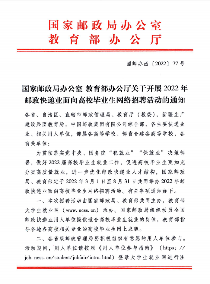 国家邮政局办公室 教育部办公厅关于开展2022年邮政快递业面向高校毕业生网络招聘活动的通知