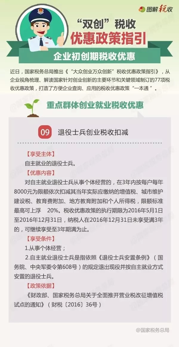 近日,国家税务总局推出《“大众创业万众创新”税收优惠政策指引》,从企业视角梳理、解读国家针对创业创新的主要环节和关键领域制订的77项税收优惠政策,打造了方便企业查询、应用的税收优惠政策“一本通 ”。我们将陆续编发77项税收优惠政策的具体内容。今天发布企业初创期税收优惠之小微企业税收优惠政策:退役士兵创业税收扣减,吸纳退役士兵就业企业税收扣减。