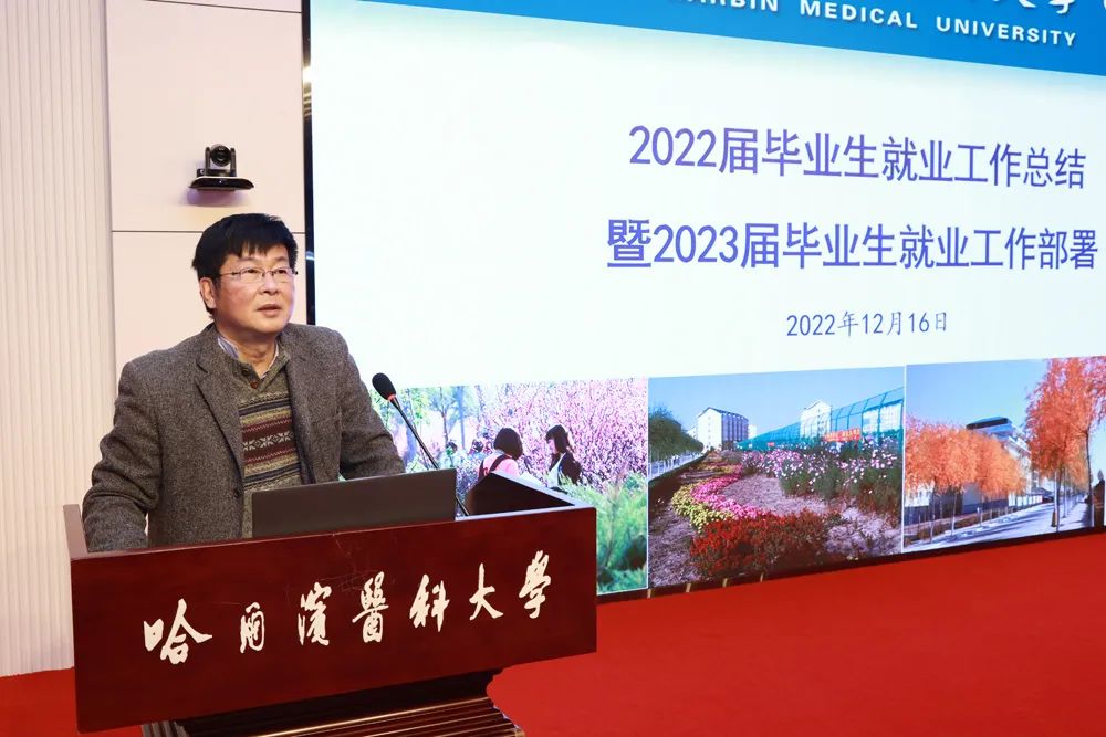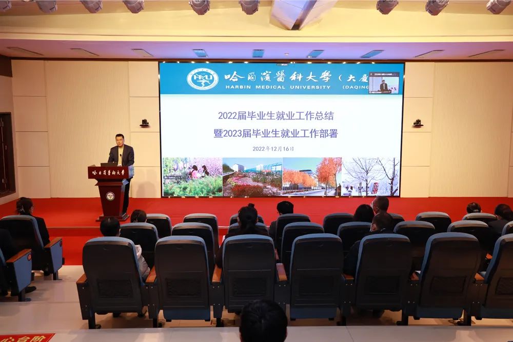 为贯彻落实教育部2023届全国普通高校毕业生就业创业工作网络视频会议精神,12月16日,哈尔滨医科大学大庆校区召开2022届毕业生就业工作总结暨2023届毕业生就业工作部署会议。学校党委书记孙瑞岐教授,校长乔远东教授,副校长孙宏丽教授,党委副书记李国军教授与学生就业工作有关的各院系及职能处室的相关人员通过线上线下相结合的方式参加会议。副校长宋印利主持会议。