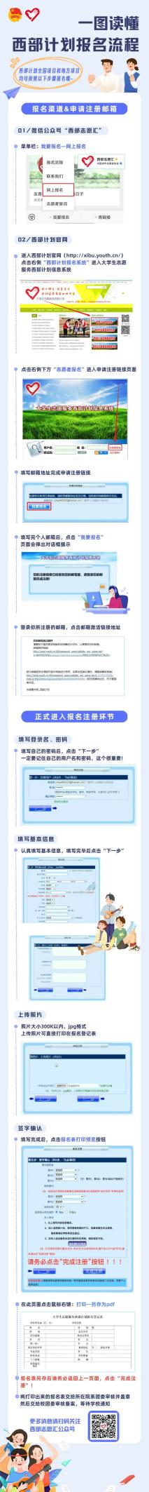 4月12日起至5月中下旬,2023年普通高等学校应届毕业生或在读研究生,可通过微信公众号“西部志愿汇”(菜单栏中的“我要报名”)或登录西部计划官网(http://xibu.youth.cn),在西部计划报名系统中进行注册报名。