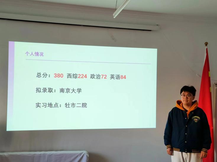 韩君明同学为我们进一步介绍了英语,政治,西综的学习方法。 他表示考研是新的起点、新的征程,同学们需要以自信的姿态,以最饱满的热情和斗志,努力拼搏,奋勇向上,去取得新一轮的胜利,实现人生的跨越。
