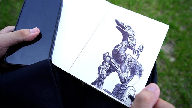 同学们目光灼灼,手中的画笔飞速运作,细致捕捉龙首的威严、鳞甲的排布、爪牙的力度,乃至每一道云纹的卷曲弧度。他们深知,这不仅是艺术鉴赏,更是一场对古代视觉密码的系统性解码。铜座龙每一处纹饰的构成,都是凝固的视觉叙事,蕴藏着金源文化的基因图谱。从具象的龙形中抽离出最核心的线条律动、形态张力和象征元素,才是同学们文创产品转化的基石。
