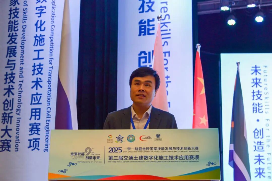 张巍结合哈尔滨“因铁轨而生”的城市基因,点赞哈铁职院作为交通英才摇篮,传承“铁的信念、铁的担当”工匠精神,与赛事主旨深度契合。他指出,交通土建正从“一锹一镐”迈向“一键生成”的数字智能时代,技能人才是变革核心。金砖大赛已成连接金砖技能合作的“黄金纽带”,本届聚焦“数字赋能基建”,是技艺比拼更是理念创新,呼应“一带一路”共建共享。作为技术支持单位,三好股份公司深耕土木教育,以数字化平台助力“以赛促教”,期待为青年搭建成长阶梯,寄语选手“既做筑路人,也做创新者”。