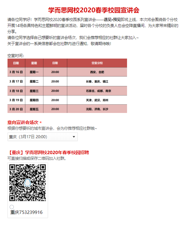 经与学而思网校HR沟通、确认,现将学而思网校2020春季校园云宣讲会信息公布如下,欢迎有意的同学积极参与