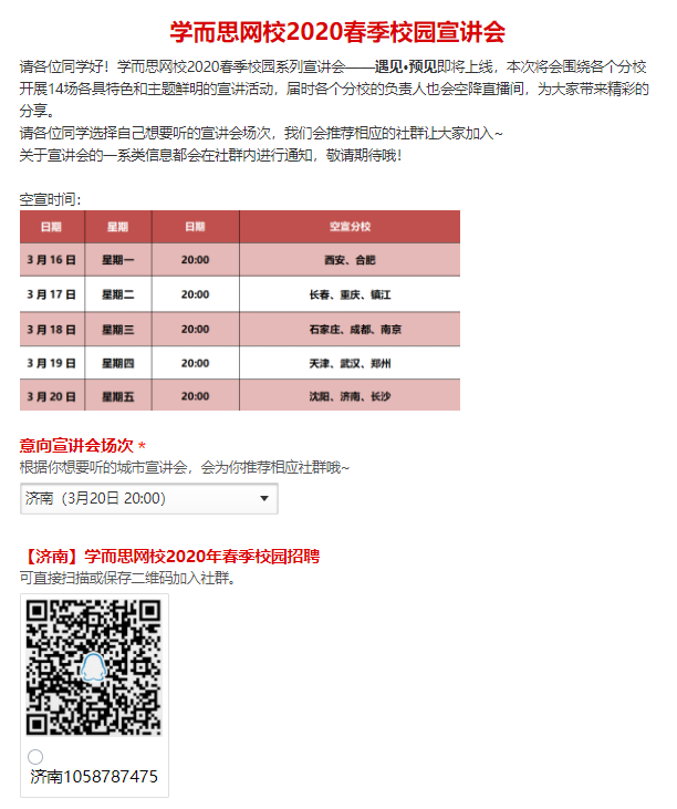 经与学而思网校HR沟通、确认,现将学而思网校2020春季校园云宣讲会信息公布如下,欢迎有意的同学积极参与